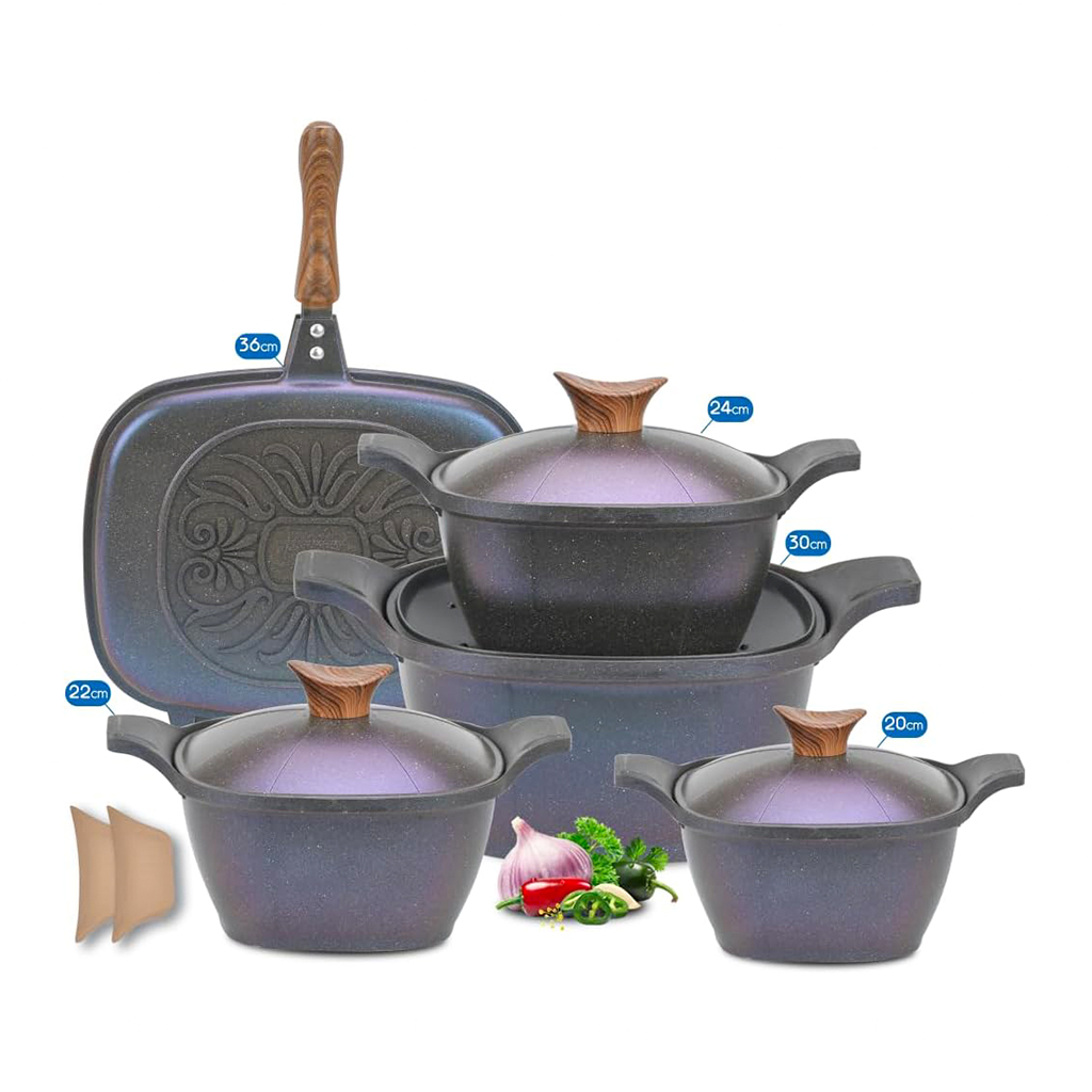 العلامة التجارية: نايس كوكر النوع: طقم حلل اللون: أزرق الخامة: تيتانيوم عدد القطع: 11 قطعة يتكون من: حلة مقاس 18 سم حلة مقاس 20 سم حلة مقاس 24 سم حلة مقاس 32 سم قلاية ووك مقاس 30 سم صينية مقاس 28 سم طاجن مقاس 36 سم متانة فائقة: مصنوع من التيتانيوم أو مطلي بطبقة تيتانيوم، مما يجعله مقاومًا للخدوش والتآكل. غير لاصق بامتياز: يتميز بسطح طهي غير لاصق عالي الجودة، يقلل الحاجة إلى الزيوت أو الدهون، مما يجعله صحيًا أكثر. تحمل درجات حرارة عالية: يتحمّل الحرارة العالية بشكل ممتاز، مناسب للطبخ على مختلف أنواع المواقد (غاز، كهرباء، سيراميك، وأحيانًا الحثّ المغناطيسي). سهل التنظيف: بفضل الطلاء غير اللاصق، يمكن تنظيفه بسهولة دون الحاجة للفرك القوي أو النقع الطويل. توزيع حراري متساوٍ: يضمن توزيعًا مثاليًا للحرارة في قاع الحلة، مما يمنع احتراق الطعام ويُساعد على نضج متوازن.