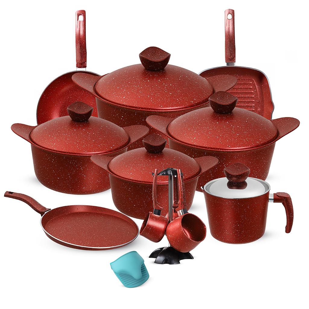 العلامةة التجارية: فاميلى النوع: طقم حلل الخامة: جرانيت عدد القطع: 19 قطعة اللون: أحمر يتكون من: حلة مقاس 18 سم حلة مقاس 20 سم حلة مقاس 24 سم حلة مقاس 28 سم قلاية ووك مقاس 28 سم قلاية كريب مقاس 28 سم قلاية جريل مقاس 28 سم لبانة بالغطاء مقاس 16 سم طقم كنك بالحامل 4 قطع ماسك سيلكون 2 قطعة سطح غير لاصق ممتاز: يضمن طهي بدون التصاق الطعام، ما يسهل عملية الطهي والتنظيف دون الحاجة لكثير من الدهون. توزيع حرارة متوازن: يوزع الحرارة بشكل متساوٍ لضمان نضج الطعام بشكل متكامل وسريع. مقاومة للخدوش والتآكل: طبقة الجرانيت الصلبة تحمي الطقم من الخدوش والتآكل، مما يطيل من عمر الاستخدام.