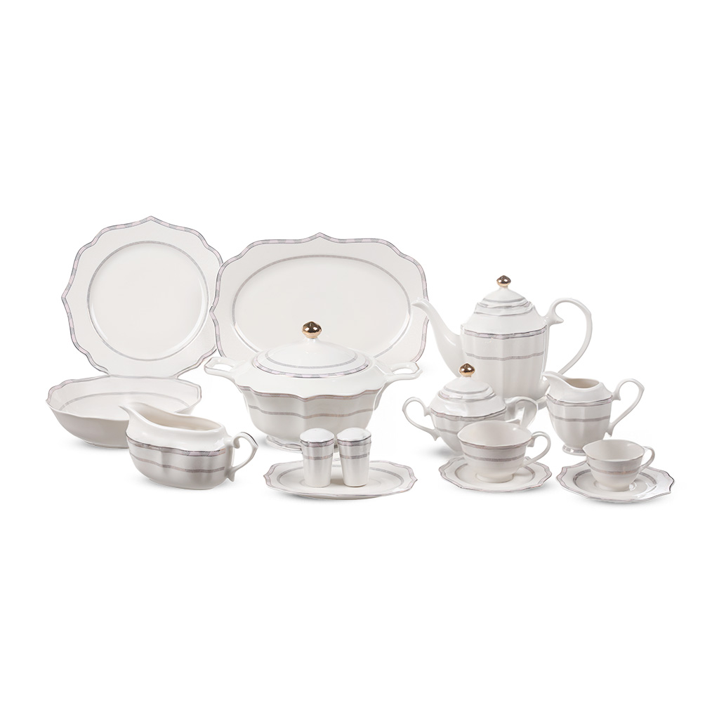 العلامة التجارية: فتحي محمود النوع: أطقم العشاء اللون: أبيض فضي عدد القطع: 72 قطعة الخامة: بورسلين يتضمن 72 قطعة مختارة بعناية: 1 براد بالغطاء 1 سكرية بالغطاء 1 لبانة 6 فنجان شاي مع 6 طبق 6 فنجان قهوة مع 6 طبق 1 بولة شوربة مع غطاء 1 بولة سلطة 6 بولة صغير 6 طبق تقديم عميق 1 سرفيس مسطتيل 1 سرفيس مربع 2 طبق تقديم 6 طبق مسطح 6 طبق عميق وسط 6 طبق عميق صغير 4 بولة صوص 2 ملاحة