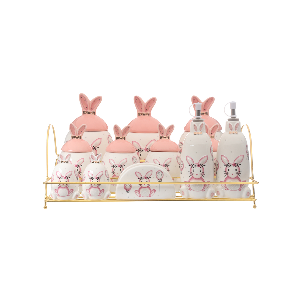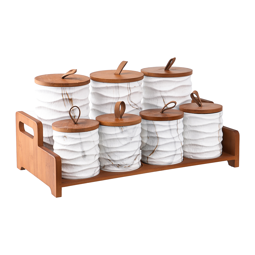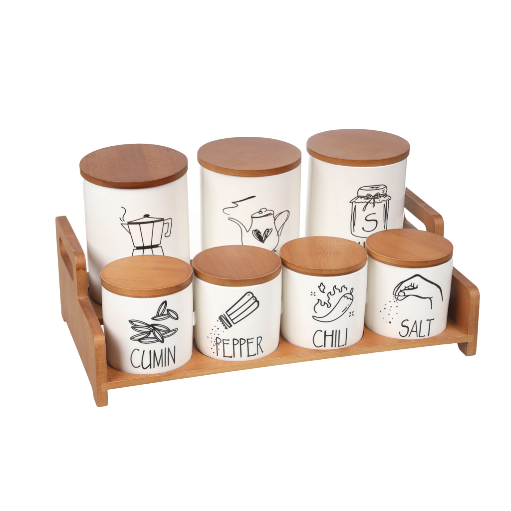 يأتي الطقم مع استاند لتخزين البرطمانات بشكل منظم، مما يساعد على ترتيب المطبخ أو رف التوابل بشكل أنيق وسهل الوصول.